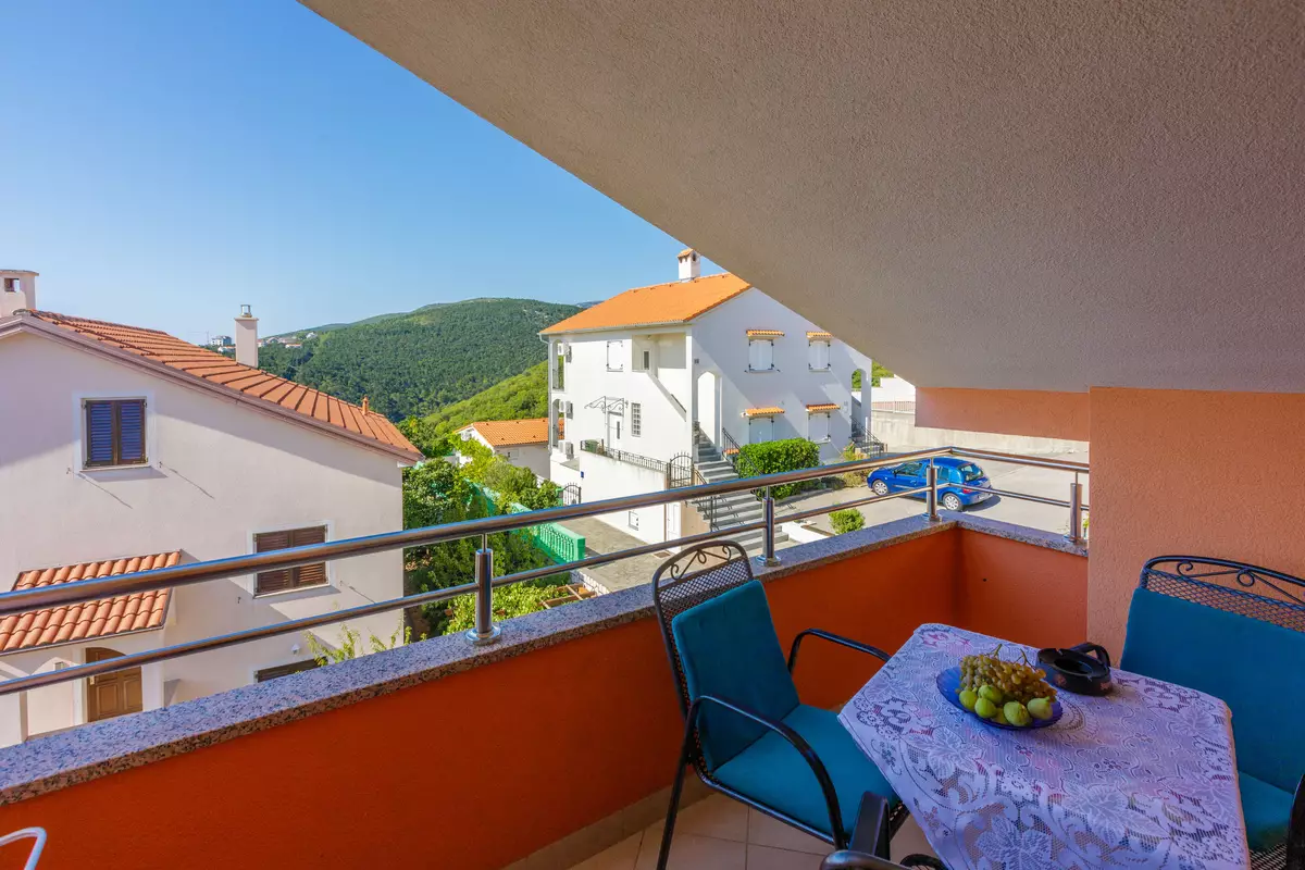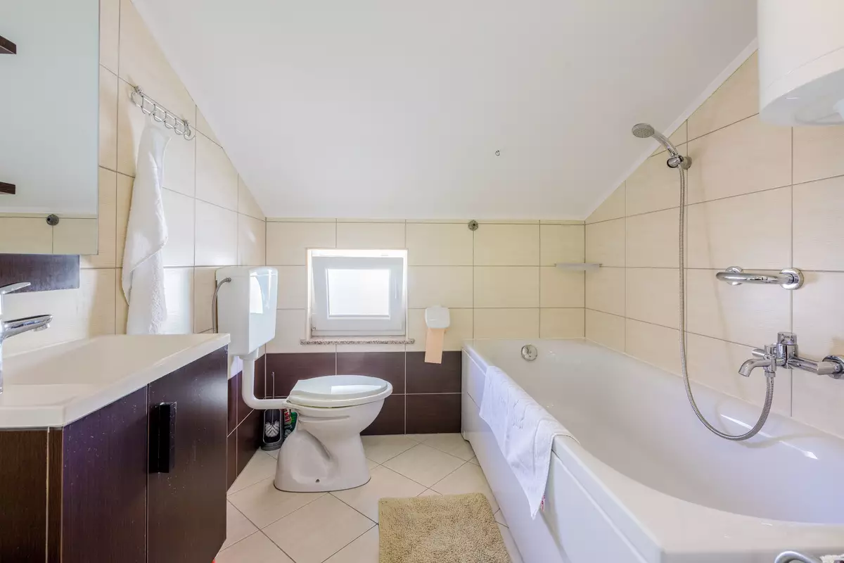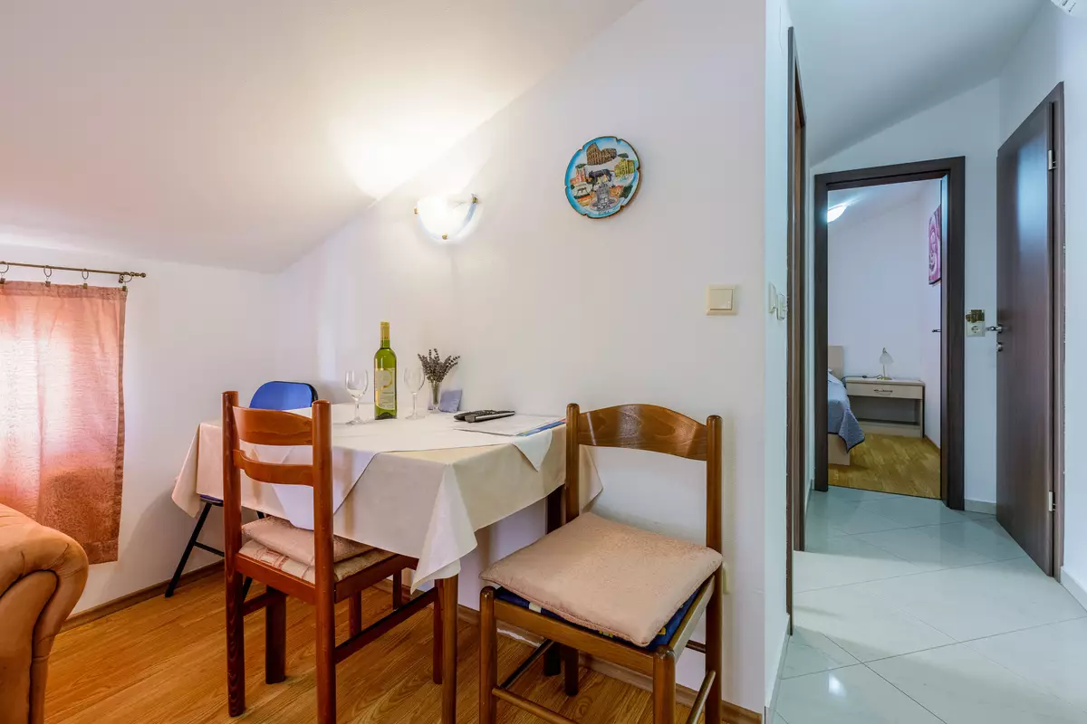 This apartment is located in the attic. It consists of a bedroom with a double bed, a bathroom with a bathtub and toilet, and a kitchen connected to the living room and dining area. From the living area there is access to a balcony with a sea view, providing a pleasant place to relax. In the living room there is also a sofa bed that can serve as an additional bed for one person. The apartment is equipped with air conditioning and Wi-Fi, while the washing machine can be used at the owner's...