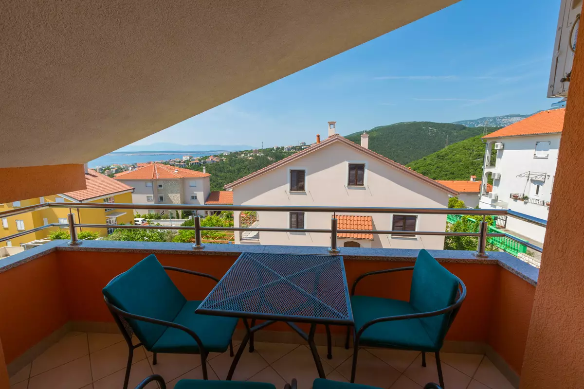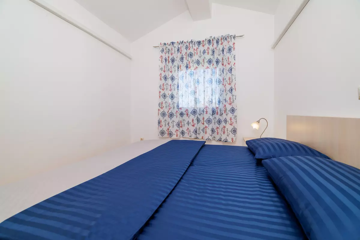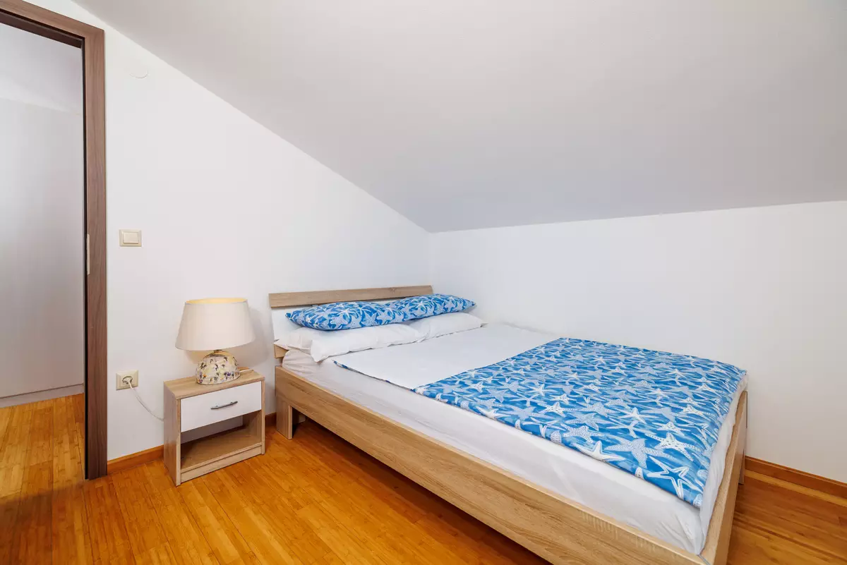 The apartment for 4–5 persons is located in the attic of the house and offers a comfortable stay with air conditioning, Wi-Fi, and a balcony with a beautiful sea view. Due to its attic location, the apartment features sloped ceilings in all rooms, giving it a unique and cozy atmosphere.